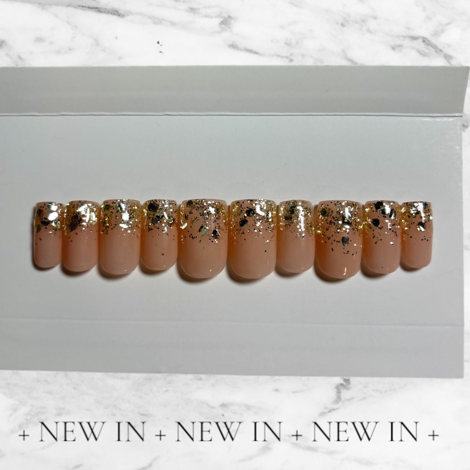 Short square press on nails with a neutral nude base and a gold glitter cascade coming from the top. Includes application bundle.