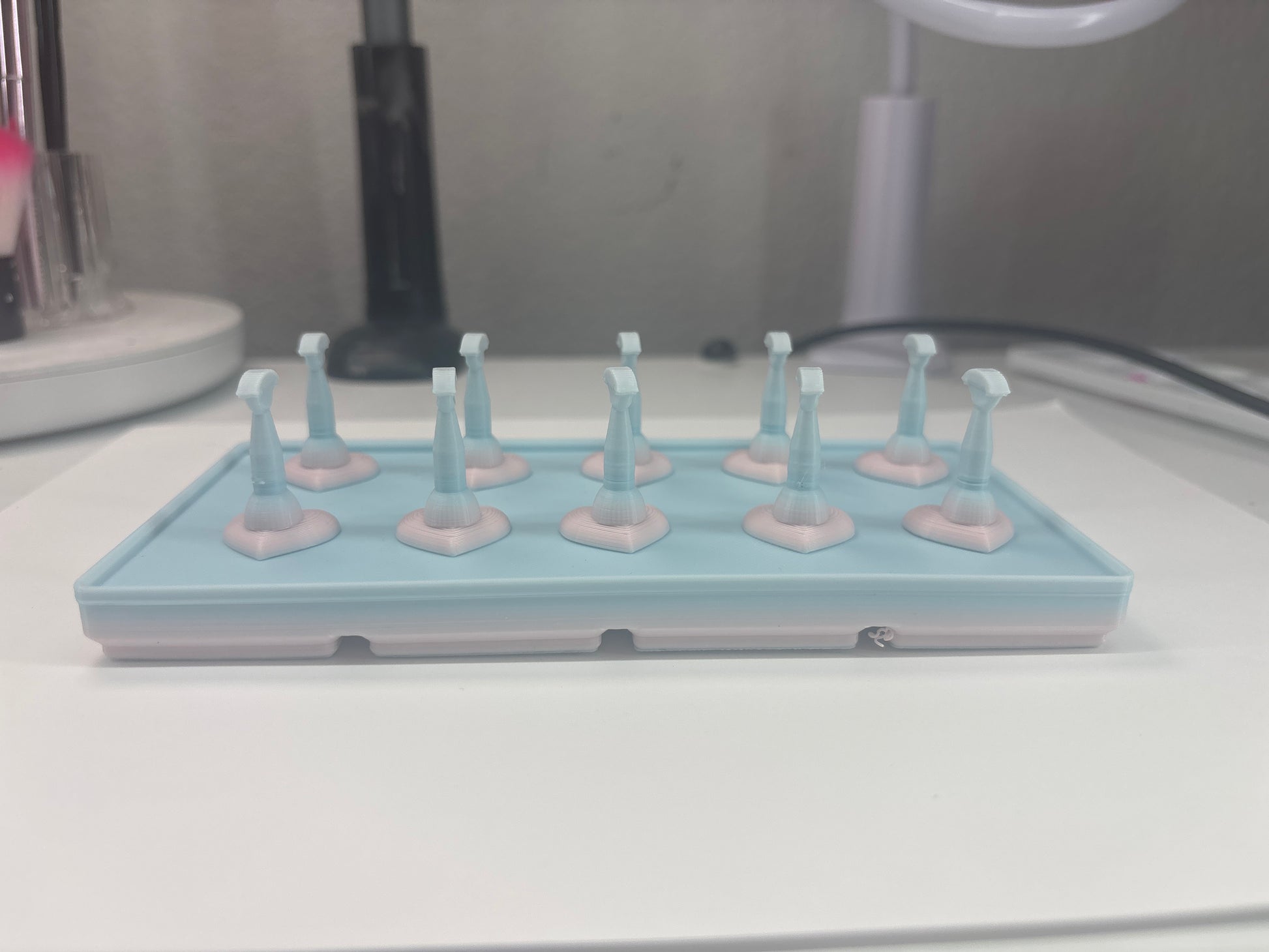 One of a kind magnetic nail stand. Includes base and 10 nail stands. The dimensions are 6.5” x 3.25”.